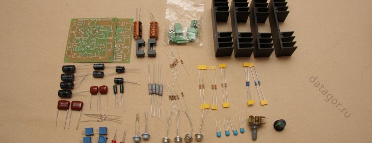 В наборе находятся активные и пассивные элементы для сборки 2-канального Стерео усилителя.